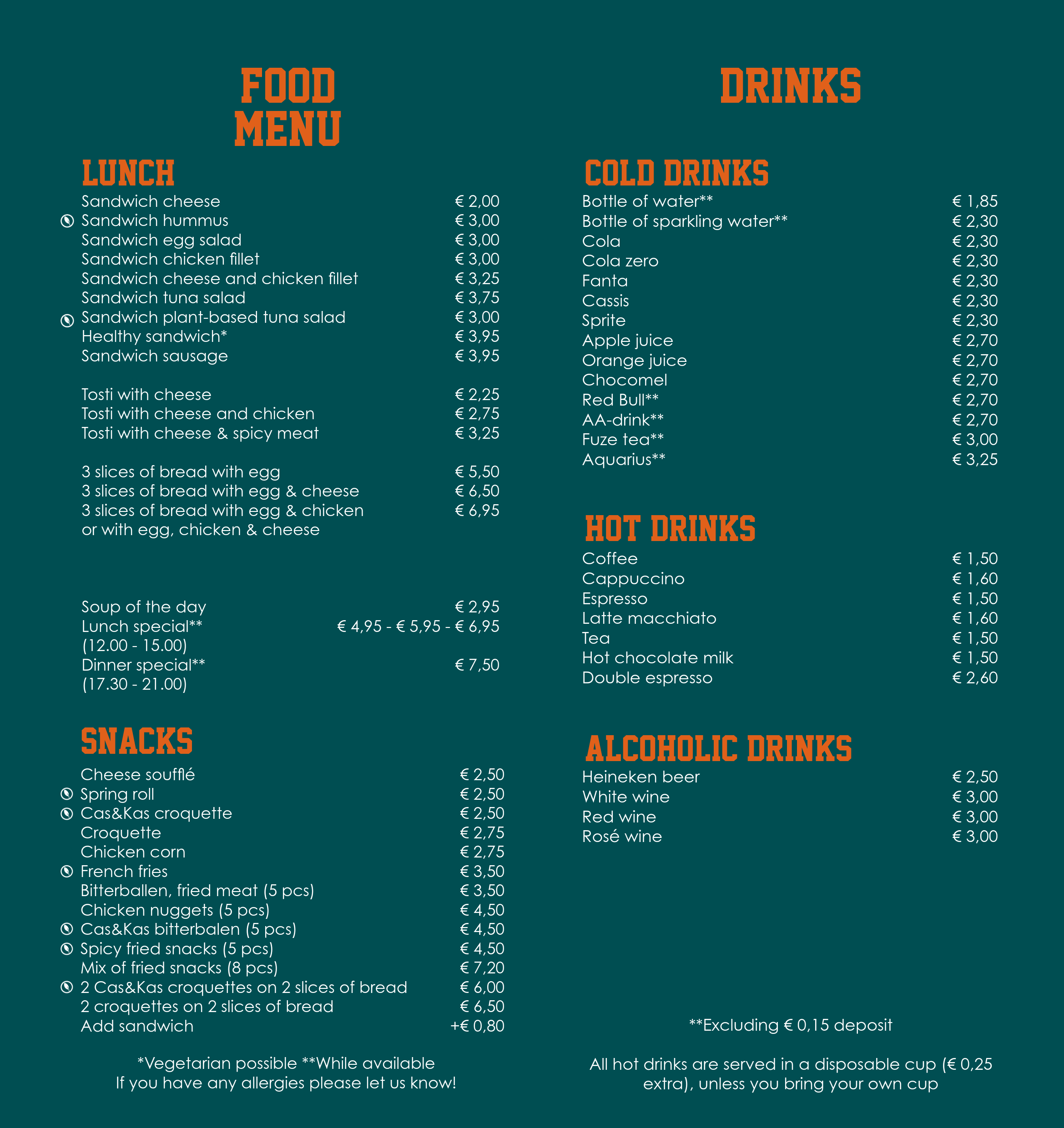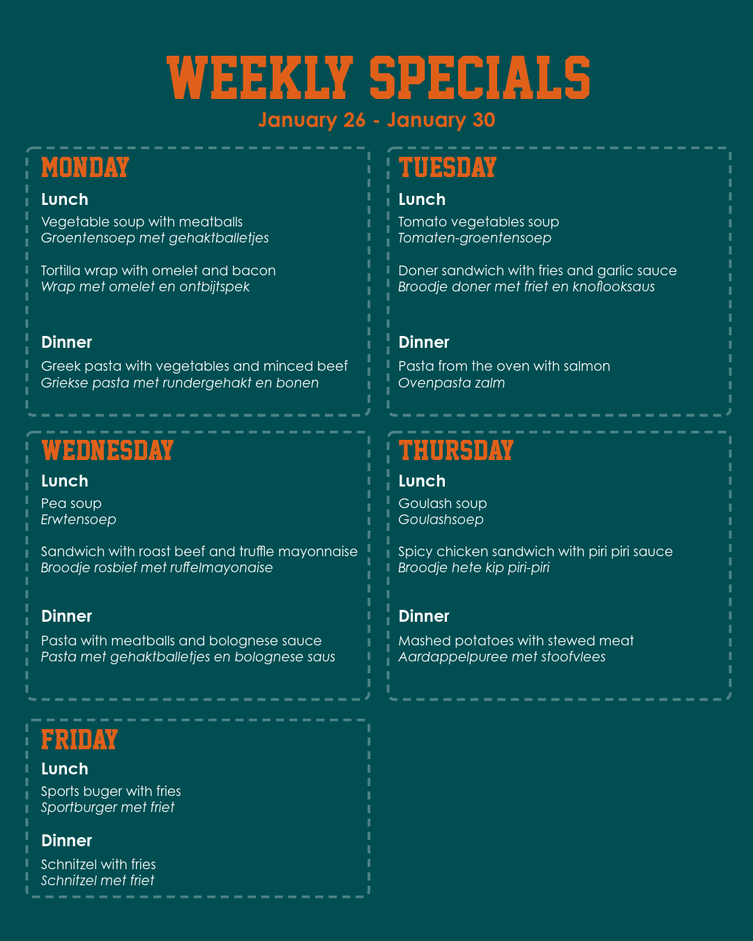 Bij het Erasmus Sport Café kun je elke dag terecht voor lekkere gerechten van onze vaste kaart. Van maandag tot en met vrijdag hebben we ook lunch en diner specials. Kom langs en geniet van onze betaalbare en smakelijke opties!